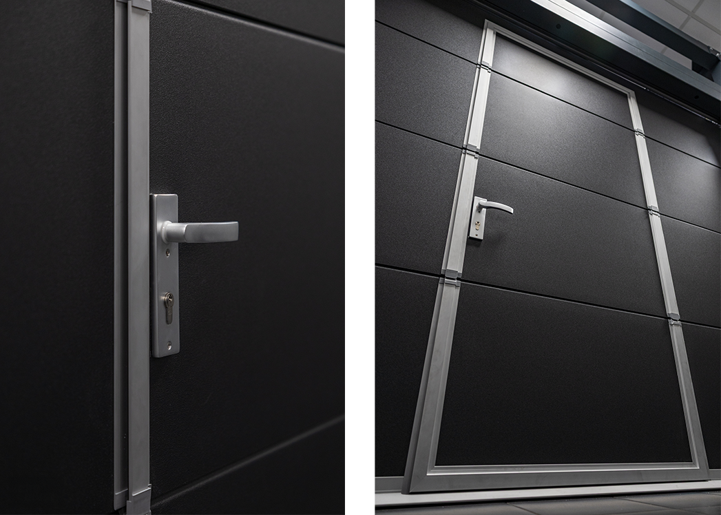 Side-Hinged Garage Doors: (Swinging Doors): These are the simple, universal two-leaf or one-leaf swinging doors made of steel. They are a reliable and proven solution that can be installed either in the garage opening (opening at 90°) or on the wall (opening at 180°). They also incorporate thermal breaks for better insulation.